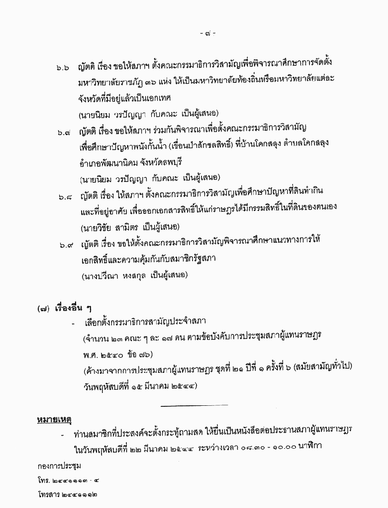 • ระเบียบวาระการประชุมสภาผู้แทนราษฎร ชุดที่ ๒๑ ปีที่ ๑ ครั้งที่ ๘ (สมัยสามัญทั่วไป) วันพฤหัสบดีที่ ๒๒ มีนาคม ๒๕๔๔