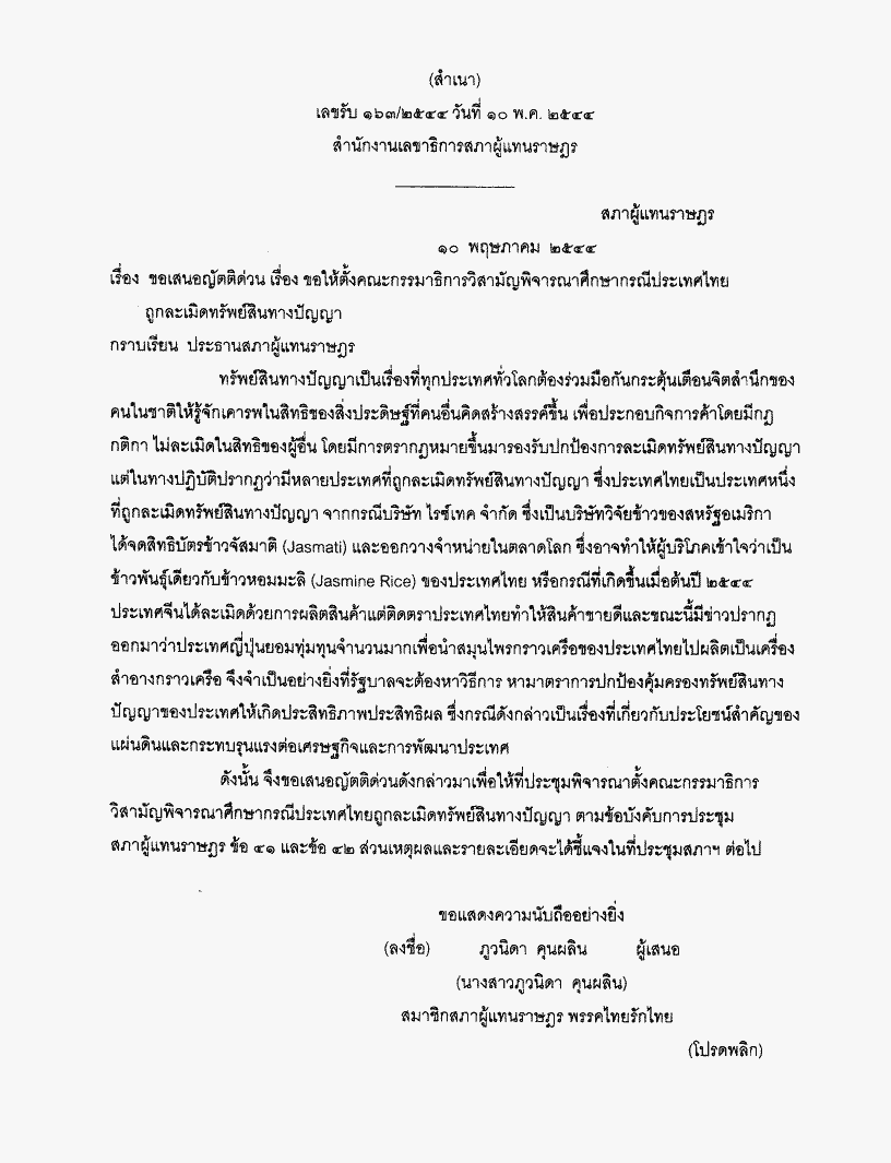ญัตติ เรื่อง ขอให้ตั้งคณะกรรมาธิการวิสามัญพิจารณาศึกษากรณีประเทศไทยถูกละเมิดทรัพย์สินทางปัญญา (นางสาวภูวนิดา คุนผลิน กับคณะ เป็นผู้เสนอ) |