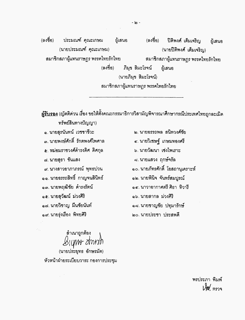 • ขอเสนอญัตติด่วน เรื่อง ขอให้ตั้งคณะกรรมาธิการวิสามัญพิจารณาศึกษากรณีประเทศไทยถูกละเมิดทรัพย์สินทางปัญญา