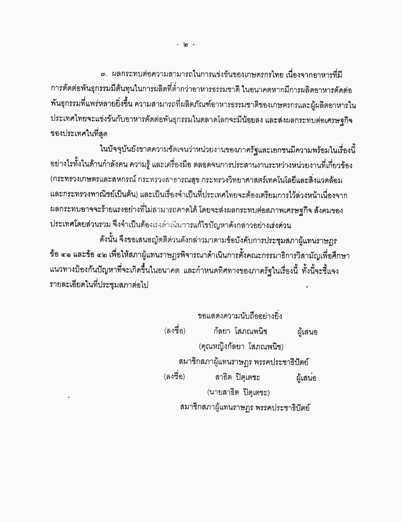 • ขอเสนอญัตติด่วน เรื่อง ขอให้สภาผู้แทนราษฎรตั้งคณะกรรมาธิการวิสามัญเพื่อพิจารณาศึกษาปัญหาการผลิตและจำหน่ายสินค้าที่มีส่วนผสมของการตัดต่อพันธุกรรม (GMOs )