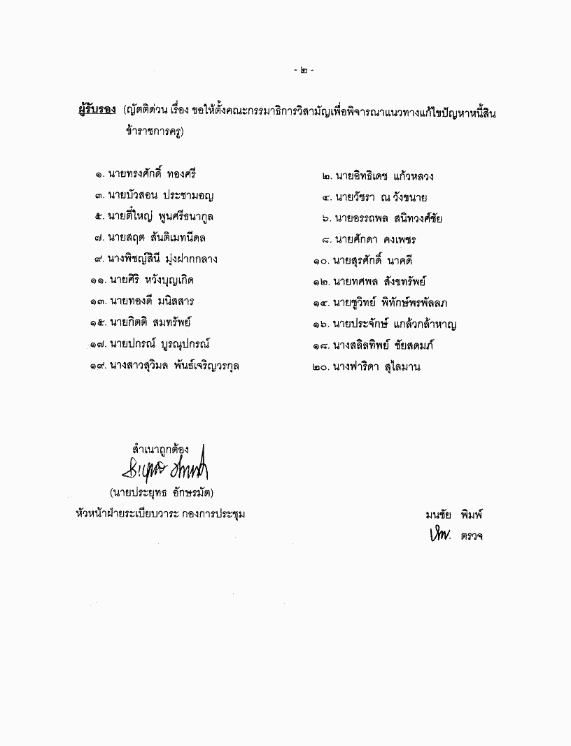 • ขอเสนอญัตติด่วน เรื่อง ขอให้ตั้งคณะกรรมาธิการวิสามัญเพื่อพิจารณาแนวทางแก้ไขปัญหาหนี้สินข้าราชการครู