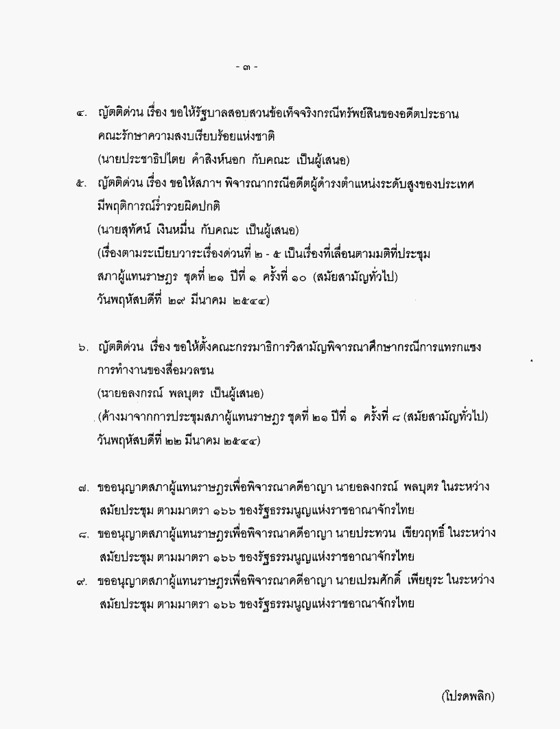 • ระเบียบวาระการประชุมสภาผู้แทนราษฎร ชุดที่ 21 ปีที่ 1 ครั้งที่ 24 (สมัยสามัญทั่วไป) วันพฤหัสบดีที่ 31 พฤษภาคม 2544