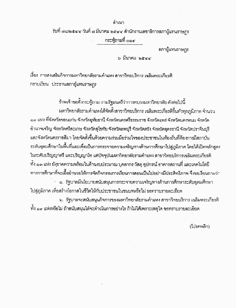 กระทู้ถามที่ ๐๑๔ เรื่อง การส่งเสริมกิจการมหาวิทยาลัยรามคำแหง สาขาวิทยบริการเฉลิมพระเกียรติ |