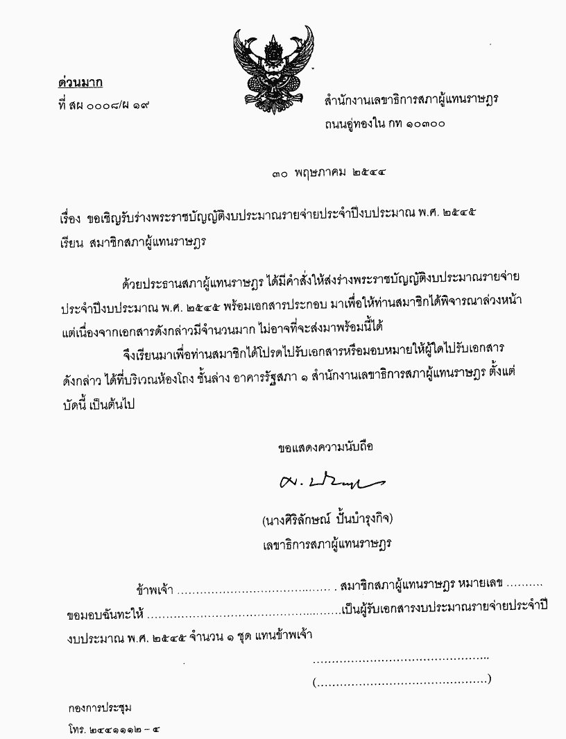 ชื่อเอกสาร : ขอเชิญรับร่างพระราชบัญญัติงบประมาณรายจ่ายประจำปีงบประมาณ พ.ศ. ๒๕๔๕