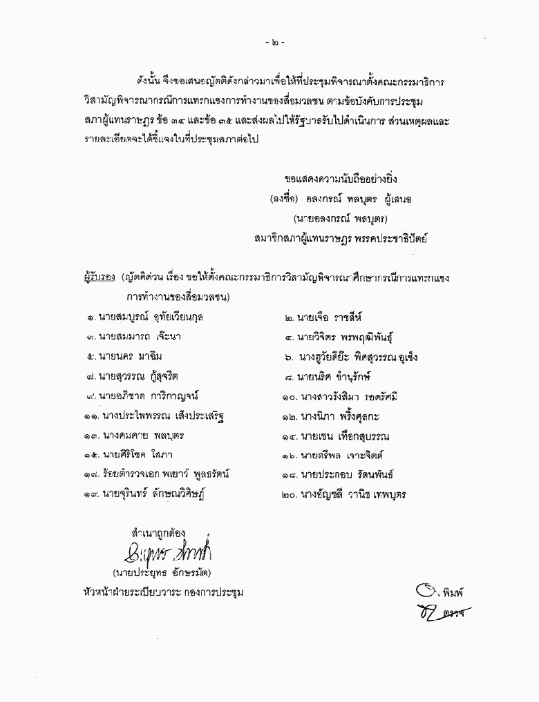 • ขอเสนอญัตติด่วน เรื่อง ขอให้ตั้งคณะกรรมธิการวิสามัญพิจารณาศึกษากรณีแทรกแซงการทำงานของสื่อมวลชน