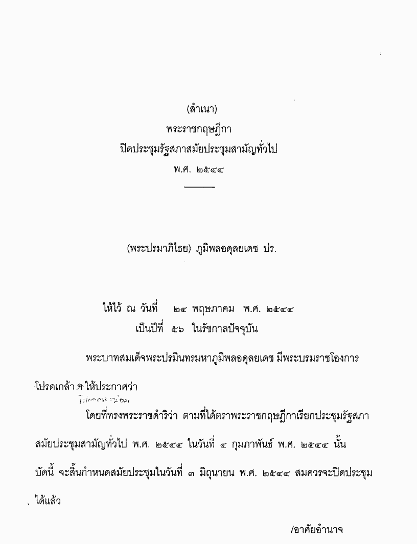 ชื่อเอกสาร : พระราชกฤษฎีกาปิดประชุมรัฐสภาสมัยประชุมสามัญทั่วไป พ.ศ. 2544