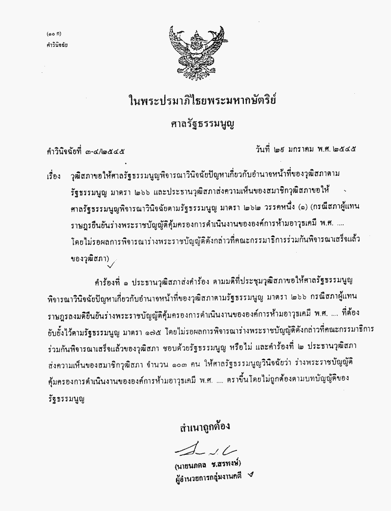 ชื่อเอกสาร :   รับทราบคำวินิจฉัยศาลรัฐธรรมนูญ เรื่อง วุฒิสภาขอให้ศาลรัฐธรรมนูญพิจารณาวินิจฉัยปัญหาเกี่ยวกับอำนาจหน้าที่ของวุฒิสภาตามรัฐธรรมนูญ มาตรา 266 และประธานวุฒิสภาส่งความเห็นของสมาชิกวุฒิสภาขอให้ศาลรัฐธรรมนูญพิจารณาวินิจฉัยตามรัฐธรรมนูญมาตรา 262 วรรคหนึ่ง (1) (กรณีสภาผู้แทนราษฎรยืนยันร่างพระราชบัญญัติคุ้มครองการดำเนินงานขององค์การห้ามอาวุธเคมี พ.ศ. .... โดยไม่ต้องรอผลการพิจารณาร่างพระราชบัญญัติดังกล่าวที่คณะกรรมาธิการร่วมกันพิจารณาเสร็จแล้วของวุฒิสภา)