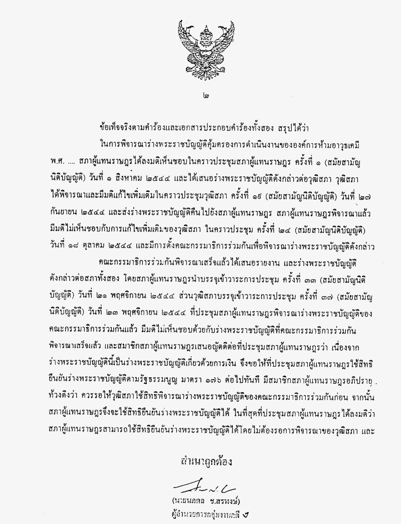 ชื่อเอกสาร :   รับทราบคำวินิจฉัยศาลรัฐธรรมนูญ เรื่อง วุฒิสภาขอให้ศาลรัฐธรรมนูญพิจารณาวินิจฉัยปัญหาเกี่ยวกับอำนาจหน้าที่ของวุฒิสภาตามรัฐธรรมนูญ มาตรา 266 และประธานวุฒิสภาส่งความเห็นของสมาชิกวุฒิสภาขอให้ศาลรัฐธรรมนูญพิจารณาวินิจฉัยตามรัฐธรรมนูญมาตรา 262 วรรคหนึ่ง (1) (กรณีสภาผู้แทนราษฎรยืนยันร่างพระราชบัญญัติคุ้มครองการดำเนินงานขององค์การห้ามอาวุธเคมี พ.ศ. .... โดยไม่ต้องรอผลการพิจารณาร่างพระราชบัญญัติดังกล่าวที่คณะกรรมาธิการร่วมกันพิจารณาเสร็จแล้วของวุฒิสภา)