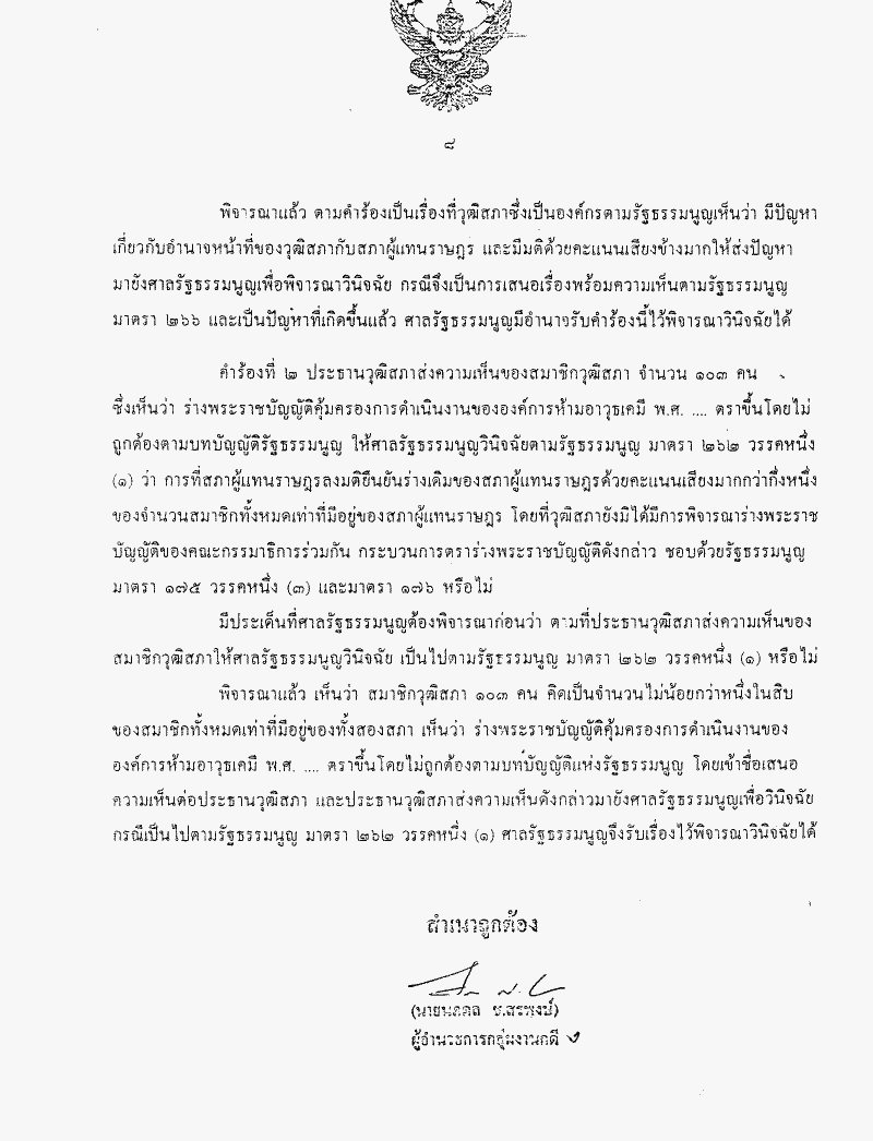 รับทราบคำวินิจฉัยศาลรัฐธรรมนูญ เรื่อง วุฒิสภาขอให้ศาลรัฐธรรมนูญพิจารณาวินิจฉัยปัญหาเกี่ยวกับอำนาจหน้าที่ของวุฒิสภาตามรัฐธรรมนูญ มาตรา 266 และประธานวุฒิสภาส่งความเห็นของสมาชิกวุฒิสภาขอให้ศาลรัฐธรรมนูญพิจารณาวินิจฉัยตามรัฐธรรมนูญมาตรา 262 วรรคหนึ่ง (1) (กรณีสภาผู้แทนราษฎรยืนยันร่างพระราชบัญญัติคุ้มครองการดำเนินงานขององค์การห้ามอาวุธเคมี พ.ศ. .... โดยไม่ต้องรอผลการพิจารณาร่างพระราชบัญญัติดังกล่าวที่คณะกรรมาธิการร่วมกันพิจารณาเสร็จแล้วของวุฒิสภา) |