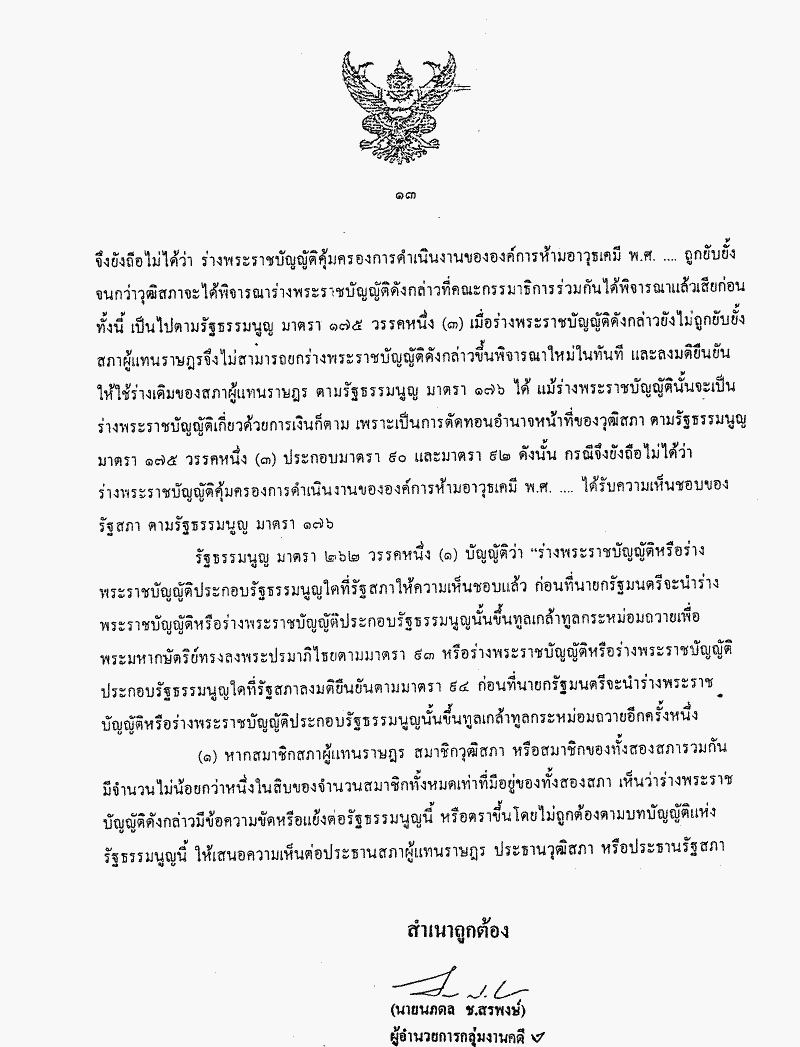 ชื่อเอกสาร :   รับทราบคำวินิจฉัยศาลรัฐธรรมนูญ เรื่อง วุฒิสภาขอให้ศาลรัฐธรรมนูญพิจารณาวินิจฉัยปัญหาเกี่ยวกับอำนาจหน้าที่ของวุฒิสภาตามรัฐธรรมนูญ มาตรา 266 และประธานวุฒิสภาส่งความเห็นของสมาชิกวุฒิสภาขอให้ศาลรัฐธรรมนูญพิจารณาวินิจฉัยตามรัฐธรรมนูญมาตรา 262 วรรคหนึ่ง (1) (กรณีสภาผู้แทนราษฎรยืนยันร่างพระราชบัญญัติคุ้มครองการดำเนินงานขององค์การห้ามอาวุธเคมี พ.ศ. .... โดยไม่ต้องรอผลการพิจารณาร่างพระราชบัญญัติดังกล่าวที่คณะกรรมาธิการร่วมกันพิจารณาเสร็จแล้วของวุฒิสภา)