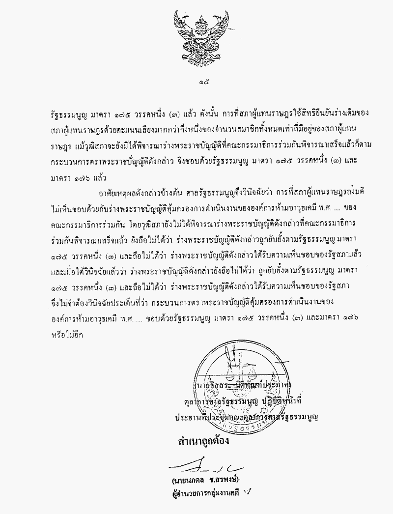 ชื่อเอกสาร :   รับทราบคำวินิจฉัยศาลรัฐธรรมนูญ เรื่อง วุฒิสภาขอให้ศาลรัฐธรรมนูญพิจารณาวินิจฉัยปัญหาเกี่ยวกับอำนาจหน้าที่ของวุฒิสภาตามรัฐธรรมนูญ มาตรา 266 และประธานวุฒิสภาส่งความเห็นของสมาชิกวุฒิสภาขอให้ศาลรัฐธรรมนูญพิจารณาวินิจฉัยตามรัฐธรรมนูญมาตรา 262 วรรคหนึ่ง (1) (กรณีสภาผู้แทนราษฎรยืนยันร่างพระราชบัญญัติคุ้มครองการดำเนินงานขององค์การห้ามอาวุธเคมี พ.ศ. .... โดยไม่ต้องรอผลการพิจารณาร่างพระราชบัญญัติดังกล่าวที่คณะกรรมาธิการร่วมกันพิจารณาเสร็จแล้วของวุฒิสภา)