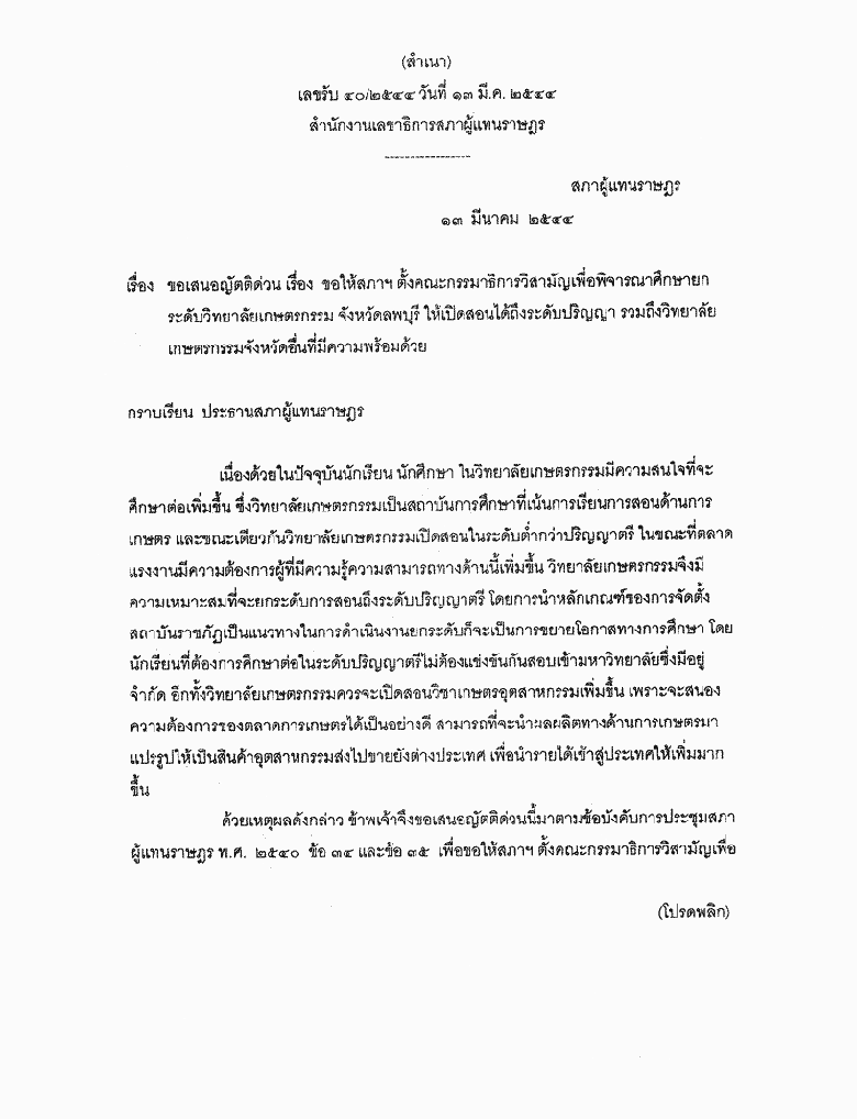 ขอเสนอญัตติด่วน เรื่อง ขอให้สภาฯ ตั้งคณะกรรมาธิการวิสามัญเพื่อพิจารณาศึกษายกระดับวิทยาลัยเกษตรกรรม จังหวัดลพบุรี ให้เปิดสอนได้ถึงระดับปริญญา รวมถึงวิทยาลัยเกษตรกรรม จังหวัดอื่นที่มีความพร้อมด้วย |