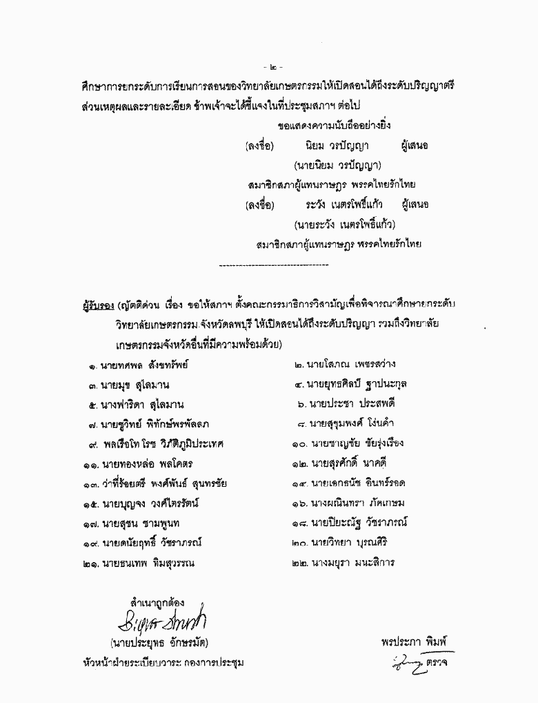 • ขอเสนอญัตติด่วน เรื่อง ขอให้สภาฯ ตั้งคณะกรรมาธิการวิสามัญเพื่อพิจารณาศึกษายกระดับวิทยาลัยเกษตรกรรม จังหวัดลพบุรี ให้เปิดสอนได้ถึงระดับปริญญา รวมถึงวิทยาลัยเกษตรกรรม จังหวัดอื่นที่มีความพร้อมด้วย