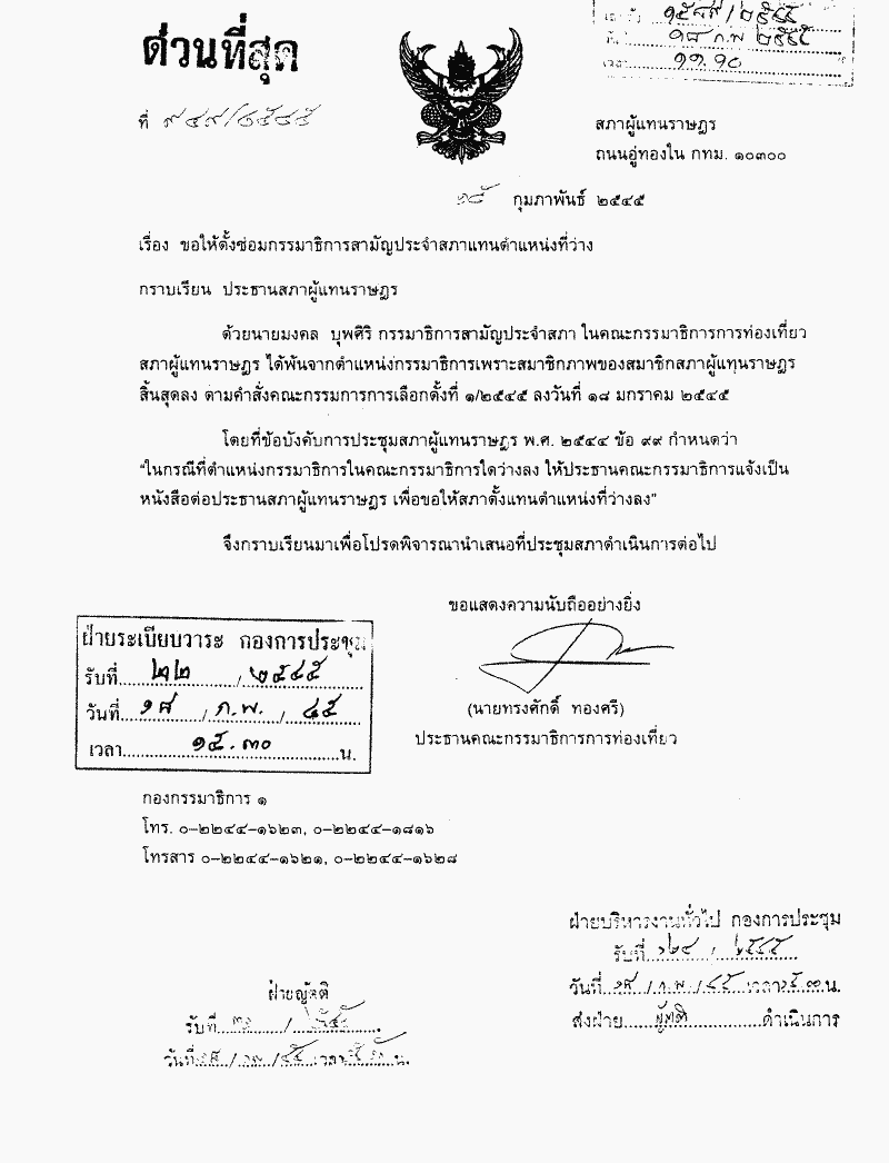 ตั้งซ่อมกรรมาธิการสามัญประจำสภา ในคณะกรรมาธิการท่องเที่ยวแทนตำแหน่งที่ว่างลง 2 ตำแหน่ง เพราะสมาชิกภาพสิ้นสุดลง (นายธีรพันธ์ วีระยุทธวัฒนะ และนายมงคล บุพศิริ) |