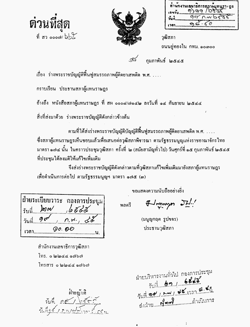• ร่างพระราชบัญญัติฟื้นฟูสมรรถภาพผู้ติดยาเสพติด พ.ศ. ....