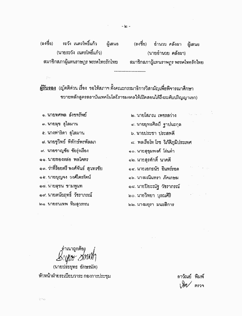 • ขอเสนอญัตติด่วน เรื่อง ขอให้สภาฯ ตั้งคณะกรรมธิการวิสามัญเพื่อพิจารณาศึกษาขยายหลักสูตรสถาบันเทคโนโลยีราชมงคลให้เปิดสอนได้ถึงระดับปริญญาเอก