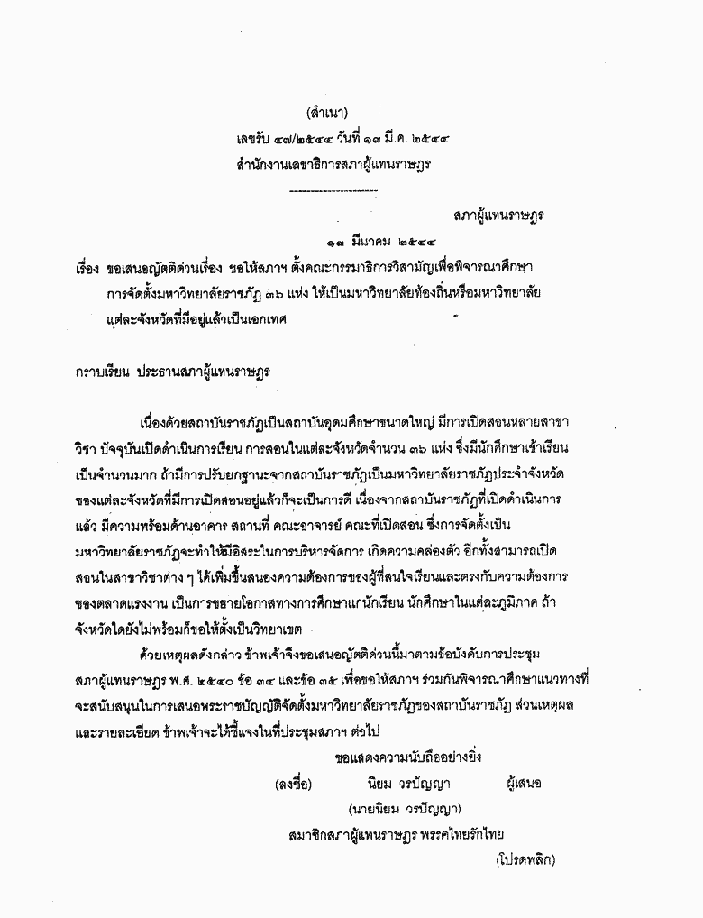 • ขอเสนอญัตติด่วน เรื่อง ขอให้สภาฯ ตั้งคณะกรรมาธิการวิสามัญเพื่อพิจารณาศึกษาการจัดตั้งมหาวิทยาลัยราชภัฏ ๓๖ แห่ง ให้เป็นมหาวิทยาลัยท้องถิ่นหรือมหาวิทยาลัยแต่ละจังหวัดที่มีอยู่แล้วเป็นเอกเทศ