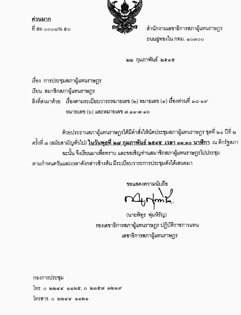 • ระเบียบวาระการประชุมสภาผู้แทนราษฎร ชุดที่ 21 ปีที่ 2 ครั้งที่ 7 (สมัยสามัญทั่วไป) วันพุธที่ 27 กุมภาพันธ์ 2545