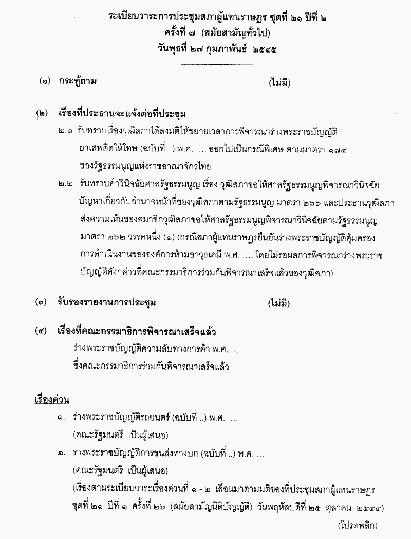 • ระเบียบวาระการประชุมสภาผู้แทนราษฎร ชุดที่ 21 ปีที่ 2 ครั้งที่ 7 (สมัยสามัญทั่วไป) วันพุธที่ 27 กุมภาพันธ์ 2545