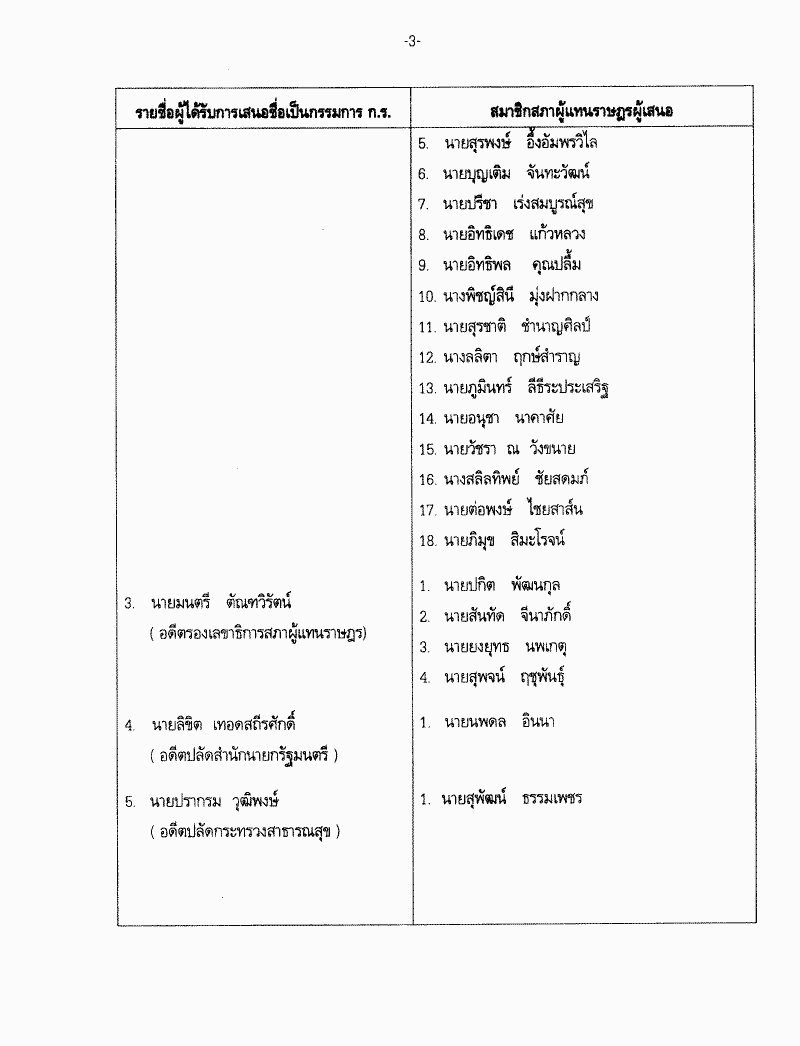 • รายชื่อผู้ทรงคุณวุฒิที่สมาชิกสภาผู้แทนราษฎรเสนอ (เลือก 1 ราย) รายชื่อผู้ได้รับการเสนอชื่อเป็นกรรมการ ก.ร. สมาชิกสภาผู้แทนราษฎรผู้เสนอ