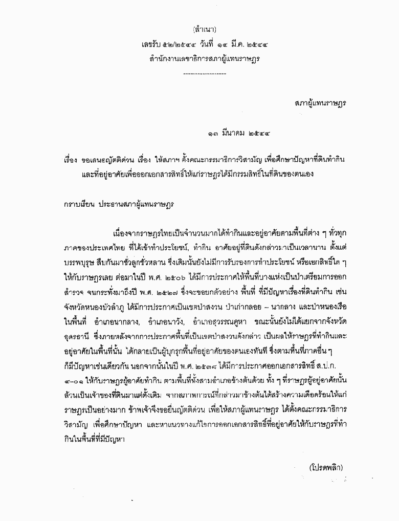 ขอเสนอญัตติด่วน เรื่อง ขอให้สภาฯ ตั้งคณะกรรมาธิการวิสามัญเพื่อศึกษาปัญหาที่ดินทำกินและที่อยู่อาศัย เพื่ออกเอกสารสิทธิ์ให้แก่ราษฎรได้มีกรรมสิทธิ์ในที่ดินของตนเอง |