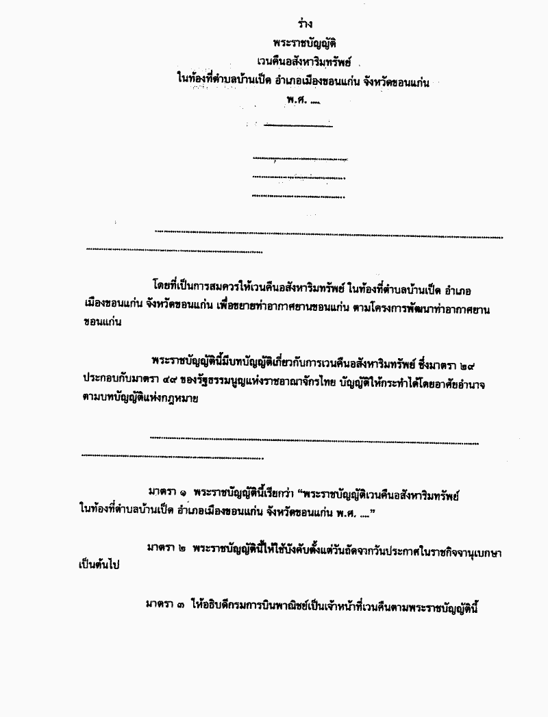 • ร่างพระราชบัญญัติเวนคืนอสังหาริมทรัพย์ ในท้องที่ตำบลบ้านเป็ด อำเภอเมืองขอนแก่น จังหวัดขอนแก่น พ.ศ. ......