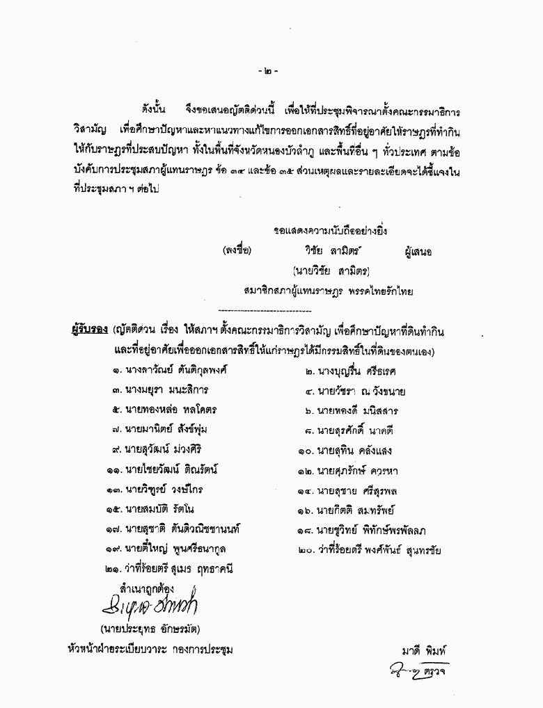 • ขอเสนอญัตติด่วน เรื่อง ขอให้สภาฯ ตั้งคณะกรรมาธิการวิสามัญเพื่อศึกษาปัญหาที่ดินทำกินและที่อยู่อาศัย เพื่ออกเอกสารสิทธิ์ให้แก่ราษฎรได้มีกรรมสิทธิ์ในที่ดินของตนเอง