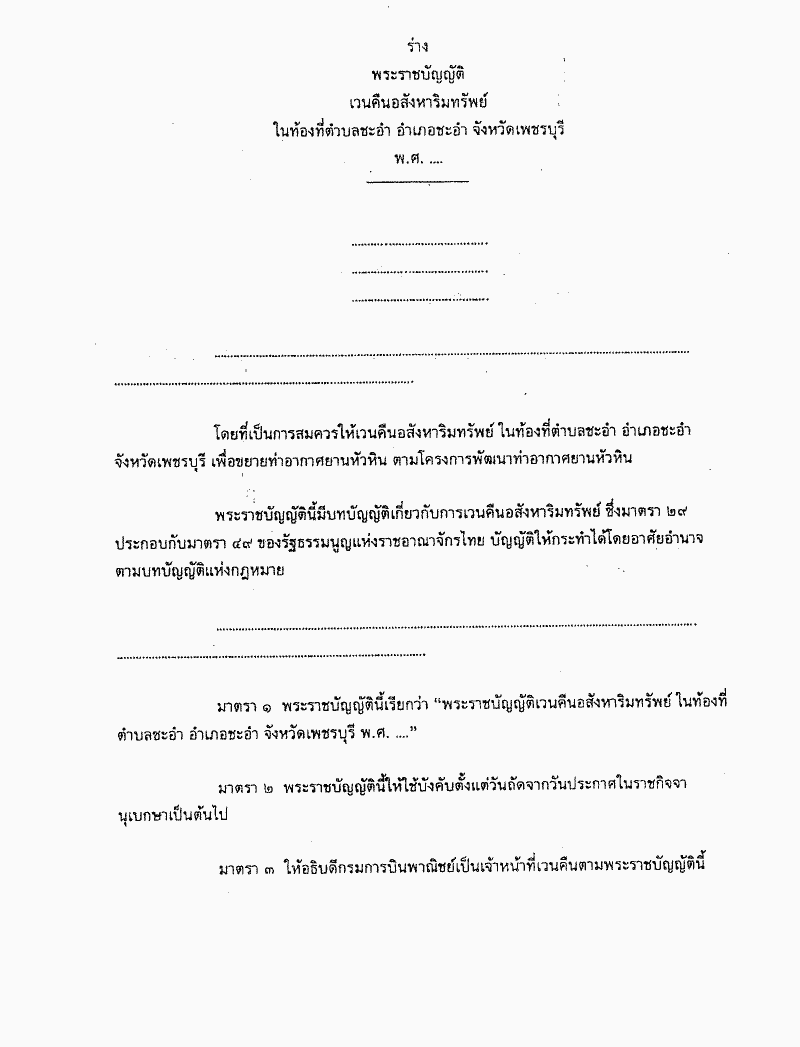 ร่างพระราชบัญญัติเวนคืนอสังหาริมทรัพย์ ในท้องที่ตำบลชะอำ อำเภอชะอำ จังหวัดเพชรบุรี พ.ศ..... |