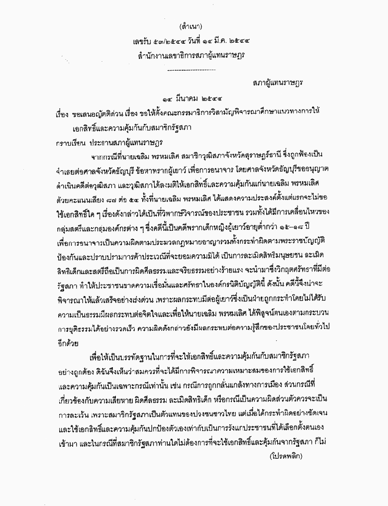 • ขอเสนอญัตติด่วน เรื่อง ขอให้ตั้งคณะกรรมธิการวิสามัญพิจารณาศึกษาแนวทางการให้เอกสิทธิ์และความคุ้มกันกับสมาชิกรัฐสภา