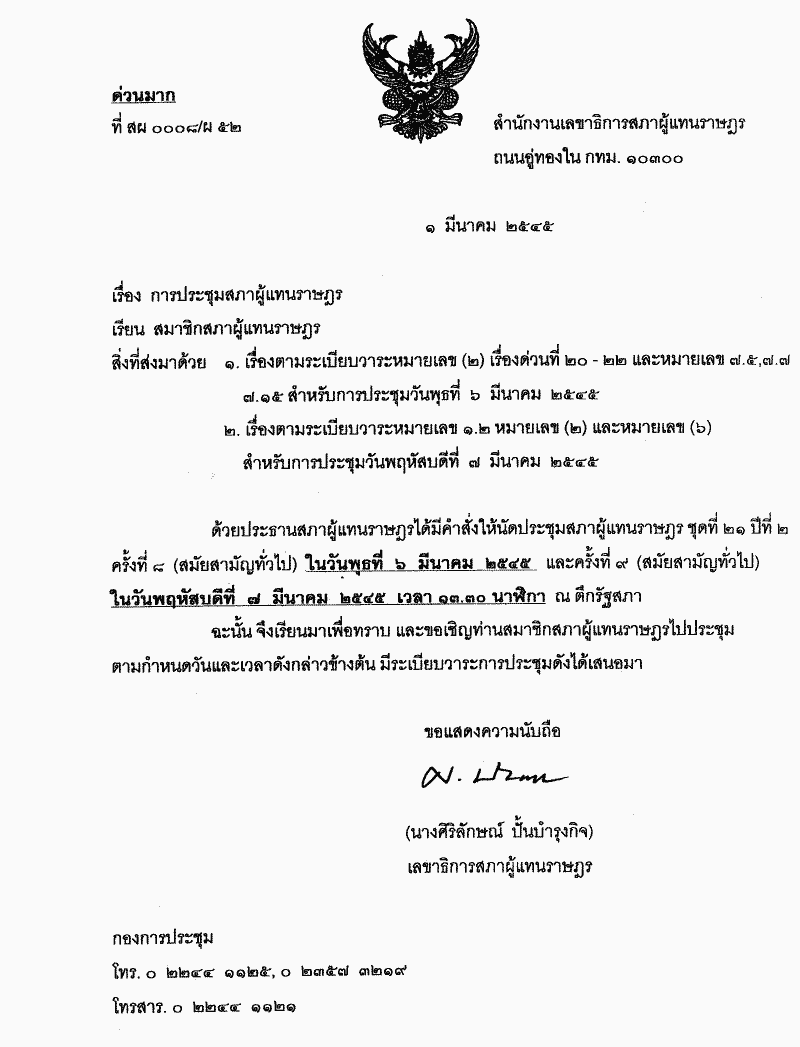 • ระเบียบวาระการประชุมสภาผู้แทนราษฎรชุดที่ 21 ปีที่ 2 ครั้งที่ 8 (สมัยสามัญทั่วไป) วันพุธที่ 6 มีนาคม 2545