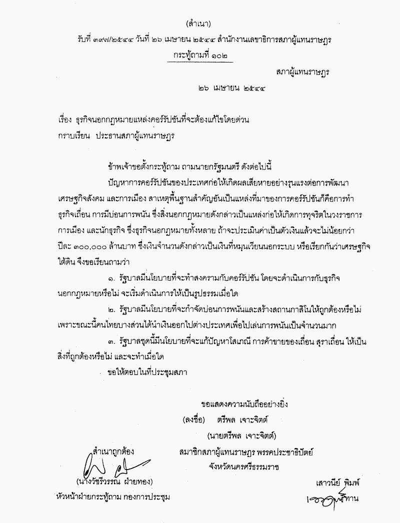 กระทู้ถามที่ 102 เรื่อง ธุรกิจนอกกฏหมายแหล่งคอร์รัปชันที่จะต้องแก้ไขโดยด่วน นายตรีพล เจาะจิตต์ เป็นผู้ตั้งกระทู้ถาม ถามนายกรัฐมนตรี |