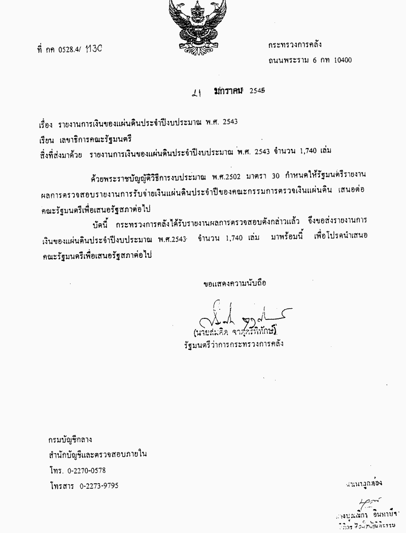 รับทราบรายงานการเงินของแผ่นดินประจำปีงบประมาณ พ.ศ. 2543