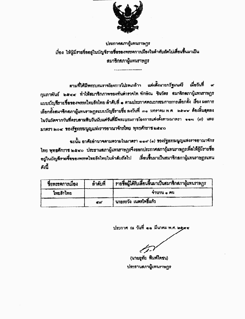 • ประกาศสภาผู้แทนราษฎร เรื่อง ให้ผู้มีรายชื่ออยู่ในบัญชีรายชื่อของพรรคการเมืองในลำดับถัดไปเลื่อนขึ้นมาเป็นสมาชิกสภาผู้แทนราษฎร