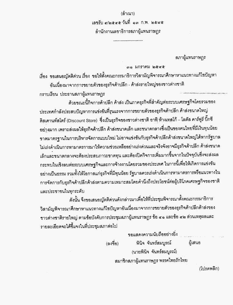 • ขอเสนอญัตติด่วน เรื่อง ขอให้ตั้งคณะกรรมาธิการวิสามัญพิจารณาศึกษาหาแนวทางแก้ไขปัญหาอันเนื่องมาจาการขยายตัวของธุรกิจค้าปลีก - ค้าส่งรายใหญ่ของชาวต่างชาติ