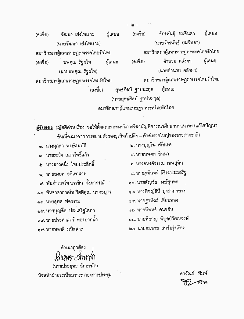 • ขอเสนอญัตติด่วน เรื่อง ขอให้ตั้งคณะกรรมาธิการวิสามัญพิจารณาศึกษาหาแนวทางแก้ไขปัญหาอันเนื่องมาจาการขยายตัวของธุรกิจค้าปลีก - ค้าส่งรายใหญ่ของชาวต่างชาติ