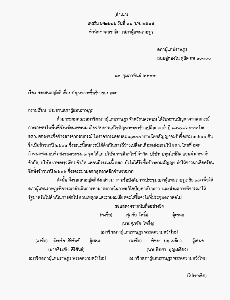 ชื่อเอกสาร :   ญัตติ เรื่อง ปัญหาการซื้อข้าวของ อตก. (นายศุภชัย โพธิ์สุ กับคณะ เป็นผู้เสนอ)