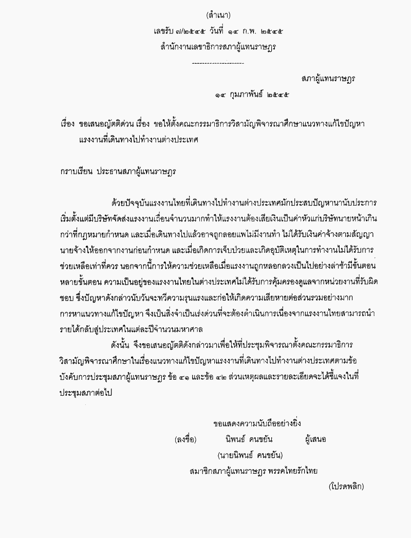 ชื่อเอกสาร :   ญัตติ เรื่อง ขอให้ตั้งคณะกรรมาธิการวิสามัญพิจารณาศึกษาแนวทางแก้ไขปัญหาแรงงานที่เดินทางไปทำงานต่างประเทศ (นายนิพนธ์ คนขยัน กับคณะ เป็นผู้เสนอ)