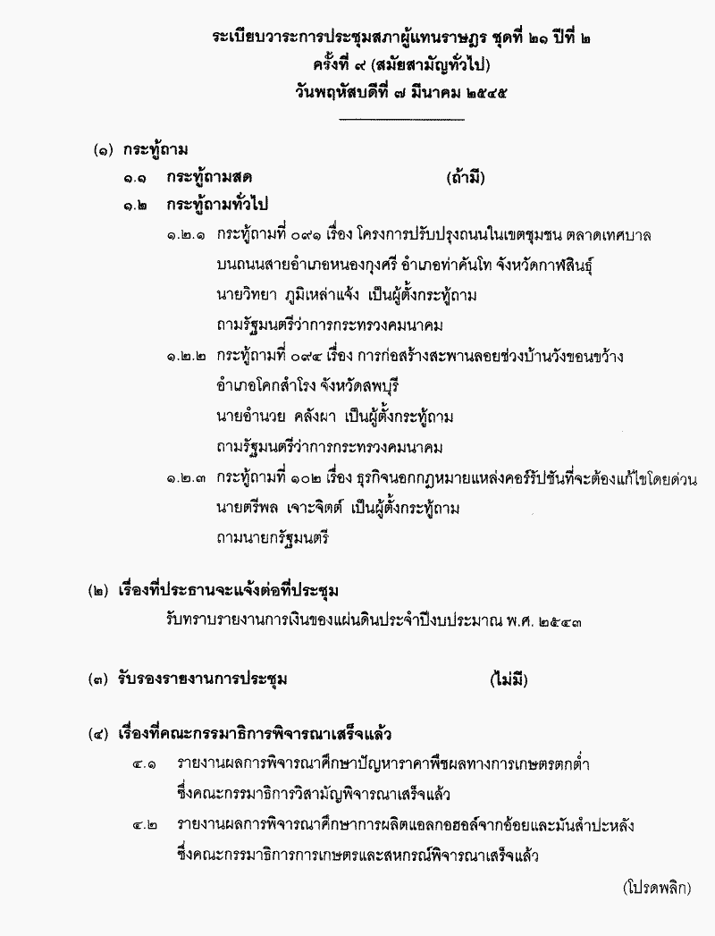 • ระเบียบวาระการประชุมสภาผู้แทนราษฎร ชุดที่ 21 ปีที่ 2 ครั้งที่ 9 (สมัยสามัญทั่วไป) วันพฤหัสบดีที่ 7 มีนาคม 2545