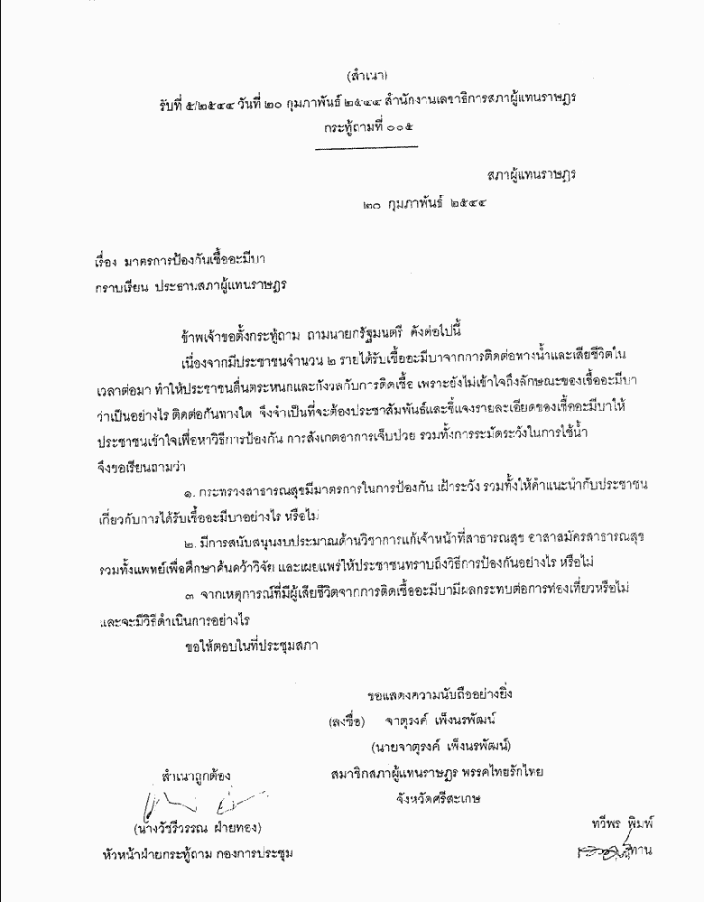 กระทู้ถามที่ ๐๐๕ เรื่องมาตรการป้องกันเชื้ออะมีบา |