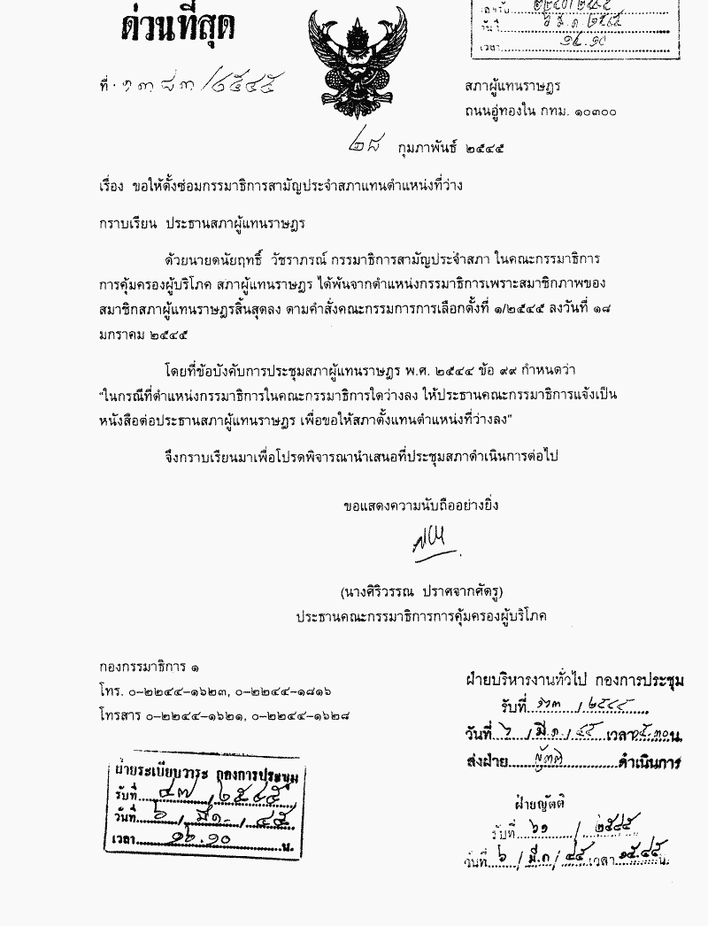 ตั้งซ่อมกรรมาธิการสามัญประจำสภา ในคณะกรรมาธิการการคุ้มครองผู้บริโภค แทนตำแหน่งที่ว่างลง 1 ตำแหน่ง เพราะสมาชิกภาพสิ้นสุดลง (นายดนัยฤทธิ์ วัชราภรณ์) |
