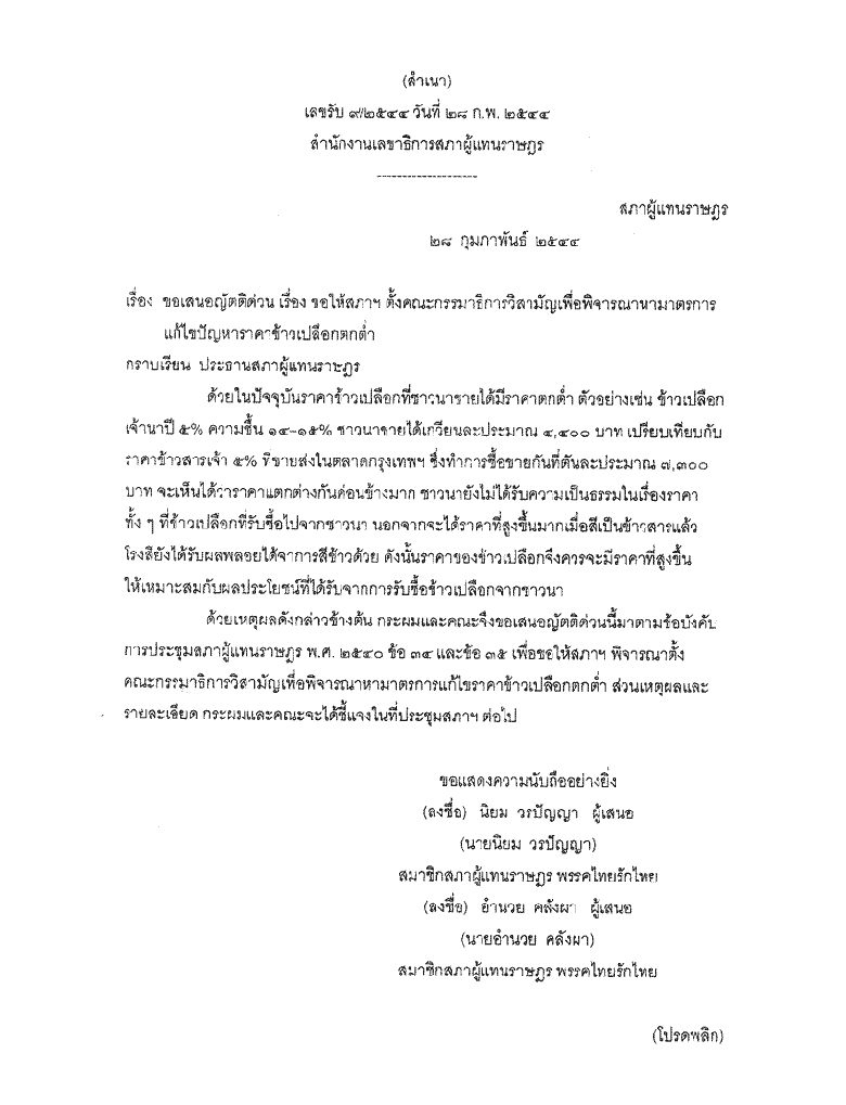 • ขอเสนอญัตติด่วน เรื่อง ขอให้สภาฯ ตั้งคณะกรรมาธิการวิสามัญเพื่อพิจารณาหามาตรการแก้ไขปัญหาราคาข้าวเปลือกตกต่ำ