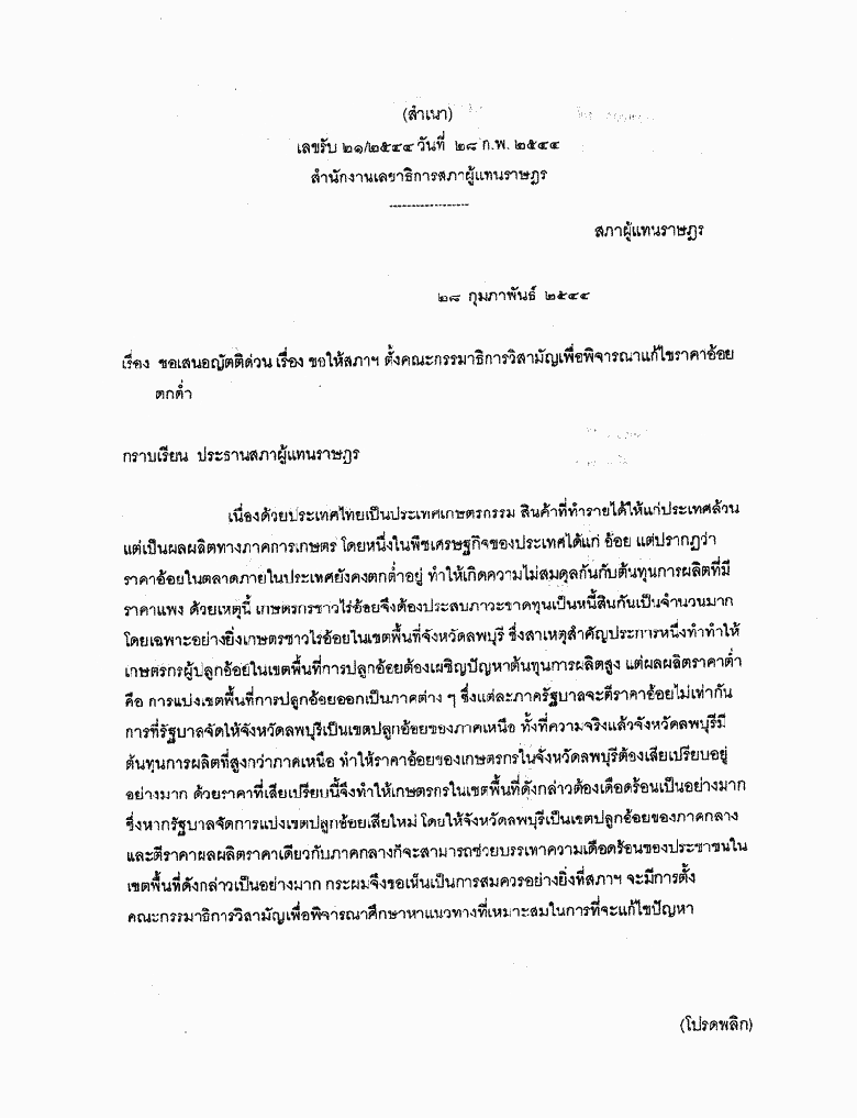 ญัตติ เรื่องขอให้สภาฯ ตั้งคณะกรรมาธิการวิสามัญเพื่อพิจารณาหามาตรการแก้ไขราคาอ้อยตกต่ำ |