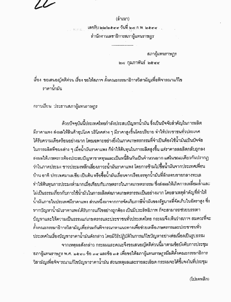 ขอเสนอญัตติด่วน เรื่อง ขอให้สภาฯ ตั้งคณะกรรมาธิการวิสามัญเพื่อพิจารณาแก้ไขราคาน้ำมัน |
