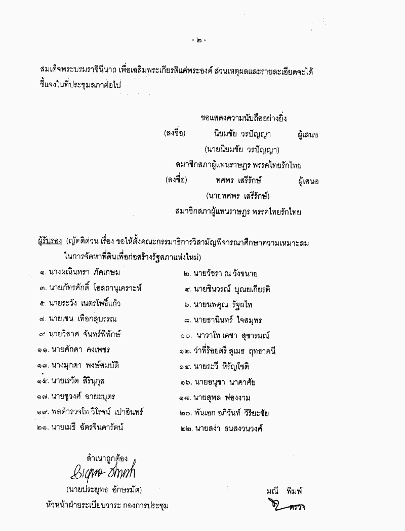 ขอเสนอญัตติด่วน เรื่อง ขอให้ตั้งคณะกรรมาธิการวิสามัญพิจารณาศึกษาจัดหาที่ดินที่เหมาะสมก่อสร้างรัฐสภาแห่งใหม่ และสถานที่ราชการ ที่อ่างแม่น้ำป่าสักชลสิทธิ์ หรือที่อื่นที่มีความเหมาะสม |