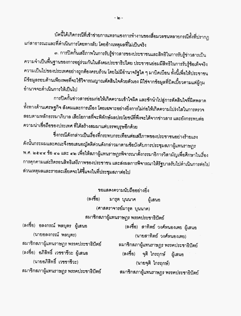 ขอเสนอญัตติด่วน เรื่อง ขอให้ตั้งคณะกรรมาธิการวิสามัญพิจารณาศึกษาเรื่องการคุกคามสิทธิเสรีภาพของประชาชน |