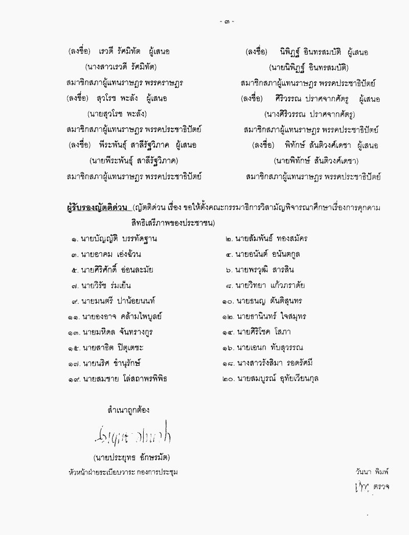 • ขอเสนอญัตติด่วน เรื่อง ขอให้ตั้งคณะกรรมาธิการวิสามัญพิจารณาศึกษาเรื่องการคุกคามสิทธิเสรีภาพของประชาชน