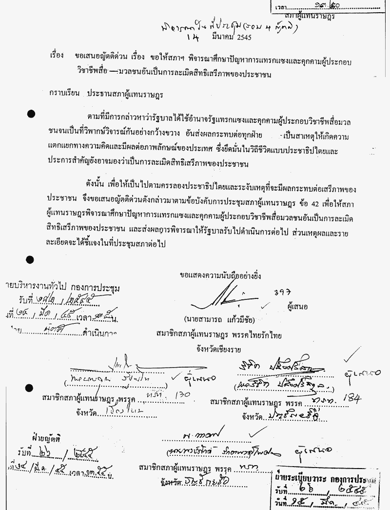 • ขอเสนอญัตติด่วน เรื่อง ขอให้สภาฯ พิจารณาศึกษาปัญหาการแทรกแซงและคุกคามผู้ประกอบวิชาชีพสื่อมวลชนอันเป็นการละเมิดสิทธิเสรีภาพของประชาชน