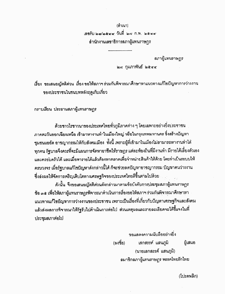 ขอเสนอญัตติด่วน เรื่อง ขอให้สภาฯ ร่วมกันพิจารณาศึกษาหาแนวทางแก้ไขปัญหาการว่างงานของประชาชนในชนบทหลังฤดูเก็บเกี่ยว |