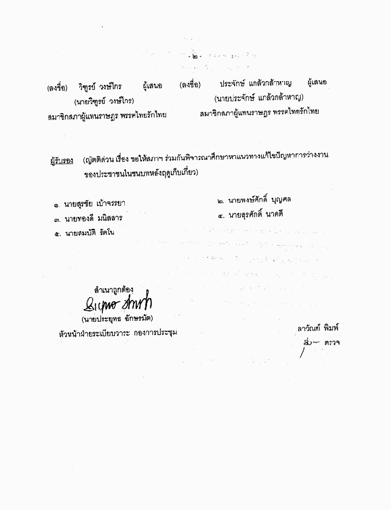 • ขอเสนอญัตติด่วน เรื่อง ขอให้สภาฯ ร่วมกันพิจารณาศึกษาหาแนวทางแก้ไขปัญหาการว่างงานของประชาชนในชนบทหลังฤดูเก็บเกี่ยว
