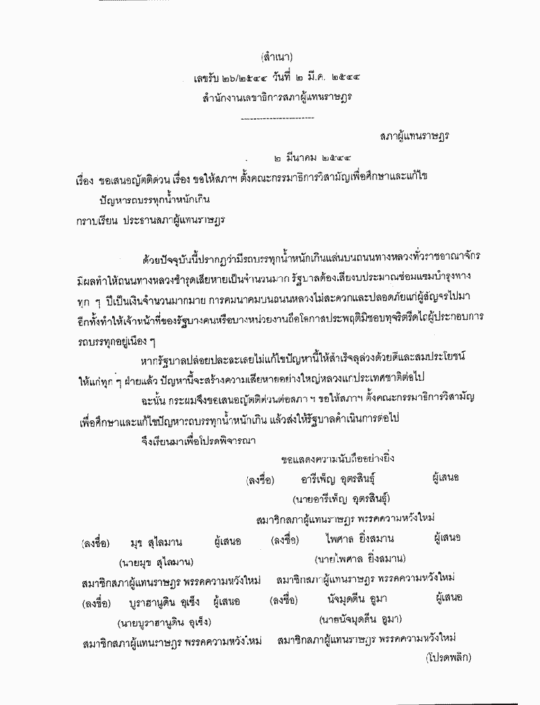 ขอเสนอญัตติด่วน เรื่อง ขอให้สภาฯ ตั้งคณะกรรมาธิการวิสามัญเพื่อพิจารณาศึกษาและแก้ไขปัญหารถบรรทุกน้ำหนักเกิน |